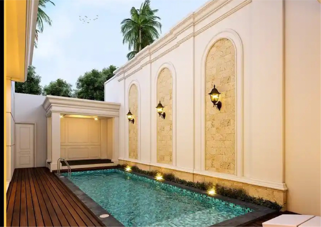Menggunakan beton berkualitas tinggi dan finishing dengan keramik atau mozaik anti slip yang tahan cuaca, membuat kolam renang outdoor tahan lama dan mudah dirawat meski digunakan di luar ruangan.